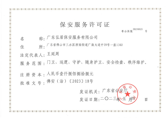 廣東弘盾保安服務(wù)有限公司東莞分公司是經(jīng)東莞市公安局嚴(yán)格審核,廣東省公安廳批準(zhǔn)頒發(fā)《保安服務(wù)許可證》,在東莞市工商行政管理機關(guān)登記注冊的,依法開展門衛(wèi)、巡邏守護、秩序維護、隨身護衛(wèi),安全檢查等綜合安保服務(wù)的專業(yè)保安服務(wù)公司... [詳細介紹]